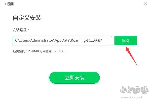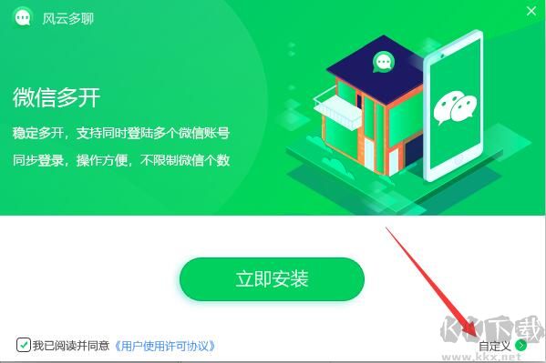 1.在kk下載站下載風(fēng)云多聊官方版安裝包,解壓后,雙擊exe程序,進入安裝界面,點擊自定義