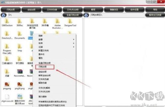 方法三:您還可以使用“全盤閃電加密”。點(diǎn)擊軟件窗口上方的【全盤閃電加密】按鈕,或者在軟件窗口左側(cè)的文件列表框中單擊鼠標(biāo)右鍵,在彈出的菜單中選擇【全盤閃電加密】。磁盤中的文件和文件夾就會全部轉(zhuǎn)移至軟件窗口右側(cè)的閃電加密區(qū)內(nèi),在磁盤中就消失了。