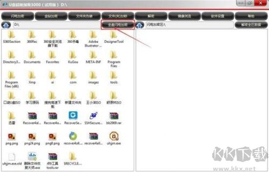 點(diǎn)擊U盤超級加密3000的軟件窗口中的全盤閃電加密按鈕就可以了。
