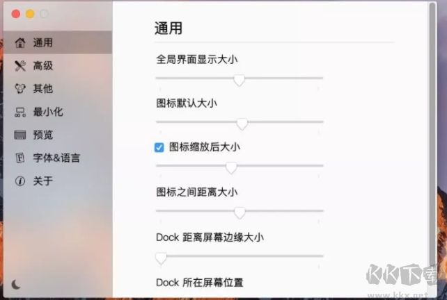 在偏好設置的通用面板中,你可以調(diào)整Dock圖標的大小、圖標之間的距離、Dock在屏幕中位置等。