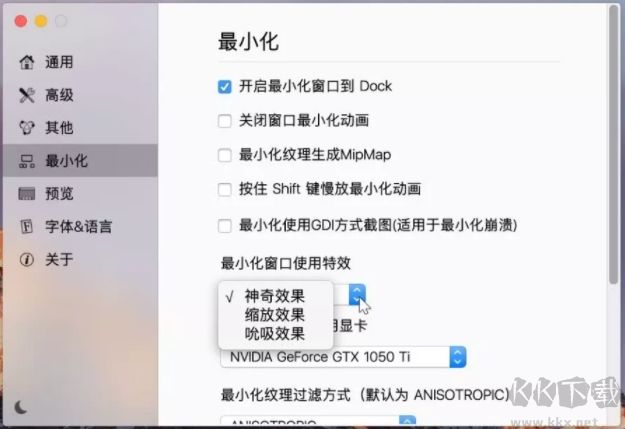 在最小化面板中,你可以更改窗口最小化的動畫效果,默認為神奇效果,如下圖2,與MacBook的原生效果基本一致。