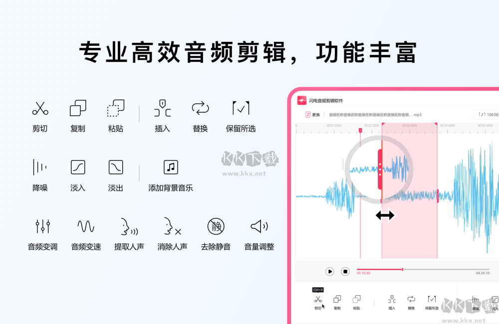 閃電音頻剪輯軟件電腦版是一款非常好用的音頻后期處理軟件,這款軟件非常的實(shí)用,用戶能夠利用這款軟件對音頻文件進(jìn)行剪切,合并等操作,用戶還能通過這款軟件提升音頻的聲音質(zhì)感,滿足不同用戶的編輯需求,感興趣或者有需要的小伙伴就快來kk網(wǎng)站下載體驗(yàn)一下吧。