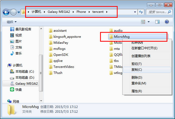 1、將安卓手機(jī)與電腦進(jìn)行連接,并打開(kāi)手機(jī)所在盤(pán)符,然后進(jìn)入tencent文件夾,再將該文件夾下的MicroMsg文件夾復(fù)制到電腦的某個(gè)文件夾中。復(fù)制完成后請(qǐng)將復(fù)制到電腦上的MicroMsg重命名為“資源目錄MicroMsg”(也可以命名為其它名稱(chēng),只是后面步驟中還需要復(fù)制出來(lái)另外一個(gè)MicroMsg文件夾,為了防止覆蓋,也為了防止發(fā)生混淆,所以需要對(duì)其進(jìn)行重命名)。