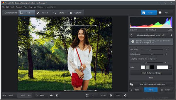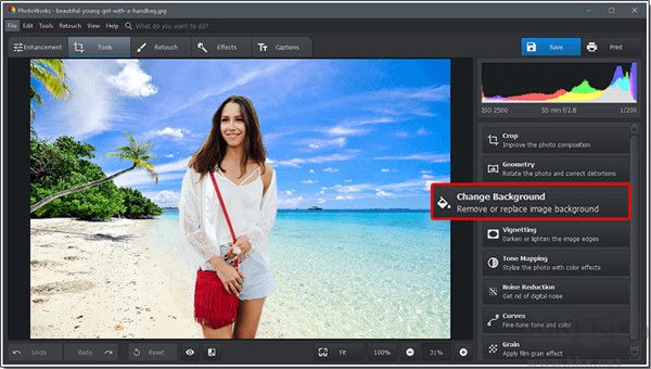 啟動 PhotoWorks,導(dǎo)入照片以添加背景并切換到工具選項(xiàng)卡。從軟件工具包中,選擇更改背景
