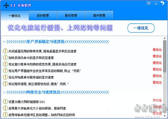 EX殺毒軟件最新版是一款占用電腦內(nèi)存非常小,功能非常強大的電腦殺毒軟件,在這款軟件里面,用戶能快速進行電腦掃描,具有本地、云端病毒庫木馬病毒殺的能力。支持多方面的系統(tǒng)優(yōu)化,一鍵就可以快速提升電腦運行速度,對系統(tǒng)進行實時監(jiān)控,讓你的電腦時時刻刻處于清潔的情況,感興趣的朋友歡前來kk網(wǎng)站修復(fù)下載體驗!