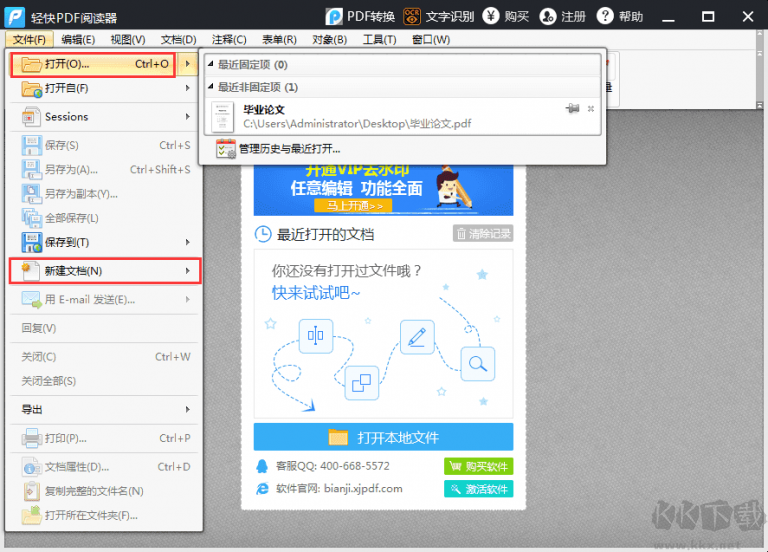 “文件”——“打開”,選擇電腦中的PDF文件,即可打開PDF文件進(jìn)行閱讀。除此之外,還可以通過“新建文檔”按鈕,創(chuàng)建一個新的空白PDF文件。(打開PDF文件,還有更快捷的方法:直接拖拽電腦中的PDF文件至軟件界面中即可打開閱讀。)