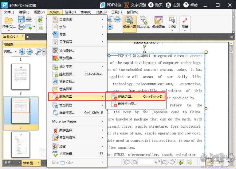 鼠標(biāo)指向“文檔”,然后選擇“刪除頁面”,有三個選項(xiàng):選擇頁、當(dāng)前頁、頁面(可批量刪除連續(xù)或不連續(xù)的頁面)