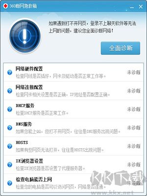 360斷網(wǎng)急救箱電腦版是一款非常專業(yè)的網(wǎng)絡(luò)修復(fù)軟件,這款軟件的功能非常的強大.用戶能夠利用這款軟件快速的檢查網(wǎng)線的網(wǎng)絡(luò)狀態(tài),還能幫助用戶快速檢查網(wǎng)卡等相關(guān)的設(shè)置,同時還能支持用戶在斷網(wǎng)的時候快速修復(fù)網(wǎng)絡(luò)連接問題,感興趣或者有需要的小伙伴就快來kk網(wǎng)站下載體驗一下吧。