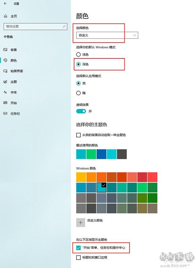除了標(biāo)準(zhǔn)的淺色和深色外,新版開(kāi)始菜單同樣支持主題換色。更換方法與現(xiàn)版一樣,打開(kāi)“設(shè)置-個(gè)性化-顏色”,將顏色模式修改為“自定義”,然后再將“選擇你的默認(rèn)Windows模式”改為“深色”。接下來(lái)挑選一款你喜歡的顏色,勾選最下方的“在下列區(qū)域顯示主題色:‘開(kāi)始’菜單、任務(wù)欄和操作中心”,片刻后開(kāi)始菜單就煥然一新了。