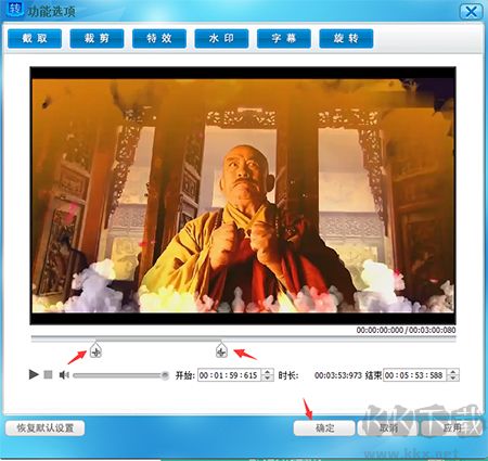 3:然后拖動“剪刀“圖標選擇開始點和結束點,選擇好以后點確定,如下圖