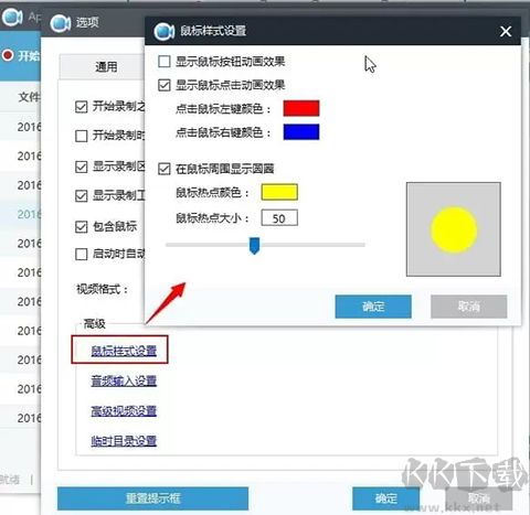 當(dāng)你想要錄制一些教程類視頻的時(shí)候,你可能就需要記錄下鼠標(biāo)的一些動(dòng)作演示。Apowersoft錄屏王就能夠幫助你順利的錄制下鼠標(biāo)的一舉一動(dòng)。首先你需要在“錄屏”設(shè)置中勾選上“包含鼠標(biāo)”,然后在“高級(jí)”設(shè)置菜單下點(diǎn)擊“鼠標(biāo)樣式設(shè)置”,在這里你可以設(shè)定鼠標(biāo)點(diǎn)擊動(dòng)畫效果的顏色、鼠標(biāo)熱點(diǎn)顏色以及大小。