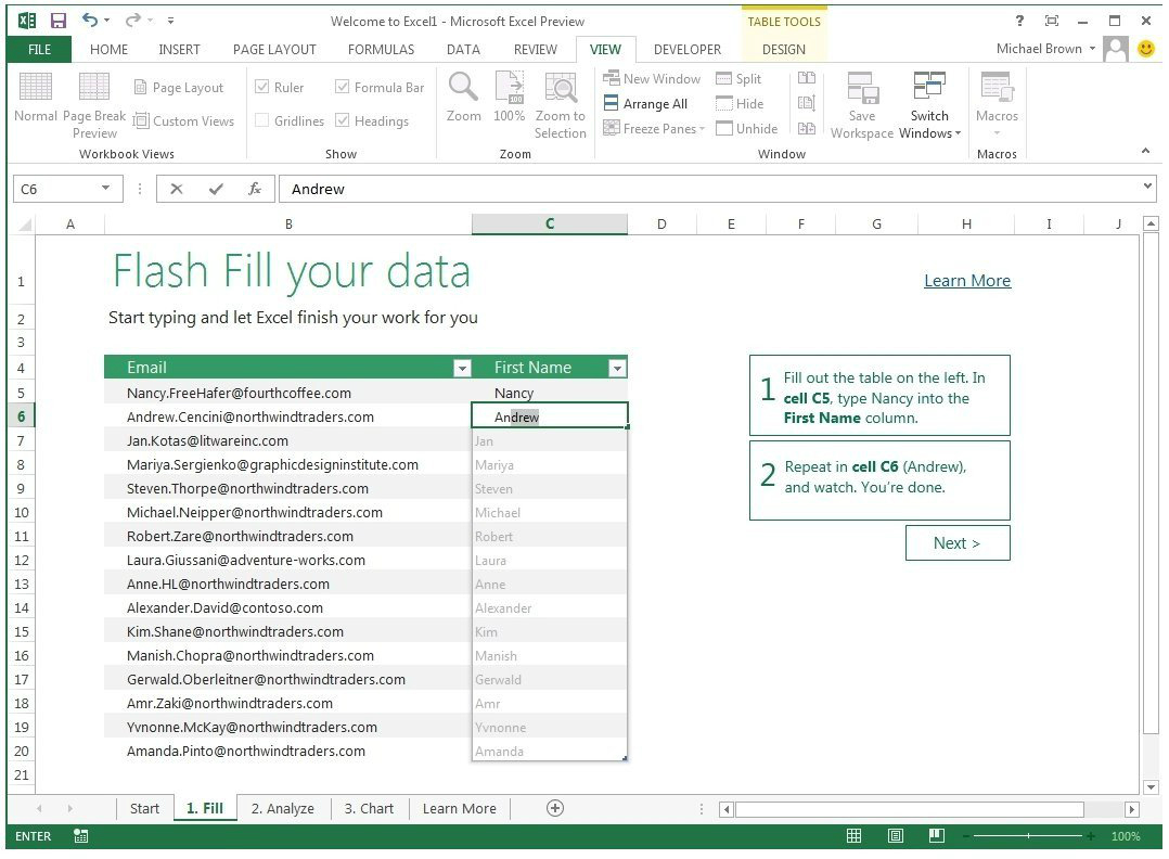 用戶可使用“快速填充”功能從導(dǎo)入的信息中輕松提取所需的內(nèi)容,并使用“推薦的數(shù)據(jù)透視表”快速執(zhí)行復(fù)雜的分析;