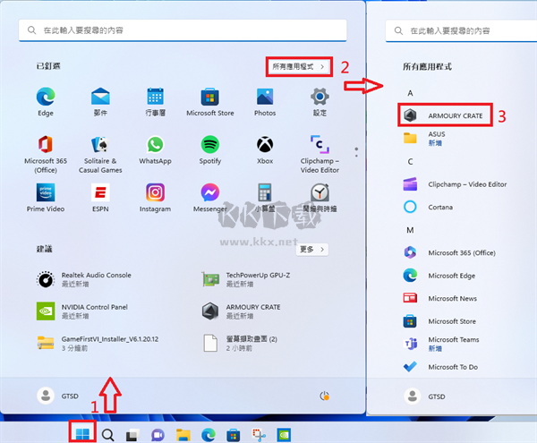 1. Windows系統(tǒng)下點(diǎn)擊開(kāi)始菜單,找到Armoury Crate軟件,并點(diǎn)擊打開(kāi),如下圖: