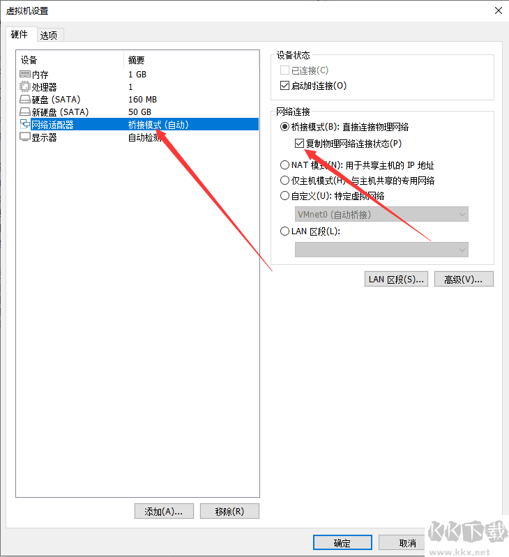 3.網(wǎng)絡(luò)適配器 僑聯(lián)模式 勾選復(fù)制物理網(wǎng)絡(luò)連接狀態(tài)
