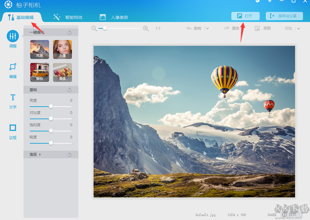 1、打開柚子相機(jī),然后點(diǎn)擊基礎(chǔ)編輯中的“打開”