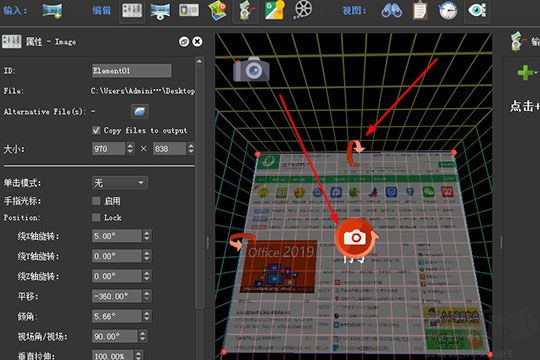3、成功添加圖片后,用戶可以調(diào)整視角,從而讓你更加方便的進行調(diào)節(jié)圖片,選中中間的按鈕即可拖動圖片,你還可以根據(jù)自己的需要調(diào)節(jié)圖片的大小與角度;如果你想要精準(zhǔn)調(diào)節(jié)其中的數(shù)值,只需要在左邊的屬性中輸入數(shù)值即可,不管是大小、旋轉(zhuǎn)角度還是平移等內(nèi)容,都可以自定義輕松調(diào)節(jié),如下圖所示:
