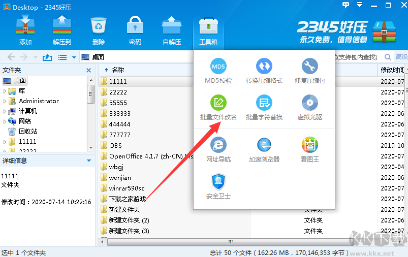 2、在好壓頁面中點擊需要修復的文件,然后點擊【工具箱】,選擇【批量文件改名】;