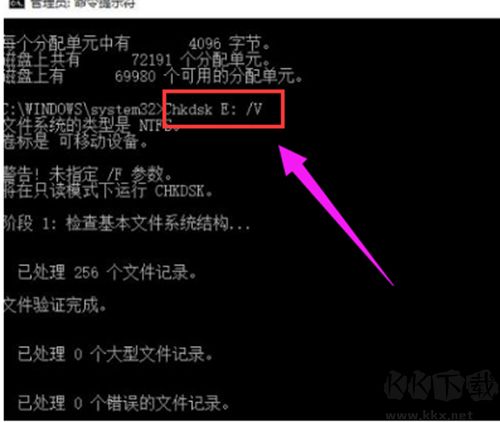 5.對于需要查詢FAT或者FAT32格式硬盤上的文件信息和完整路徑,則直接輸入Chkdsk E: /V 并回車即可。