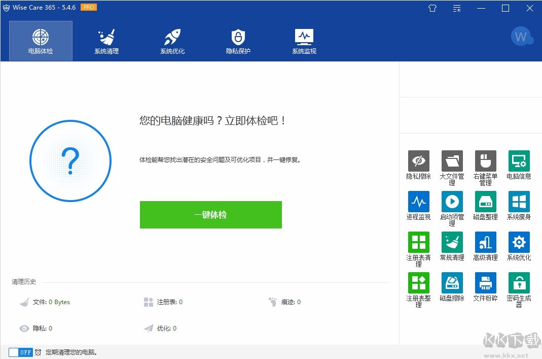 Wise Care 365 Pro是一款非常不錯(cuò)的系統(tǒng)優(yōu)化清理軟件,它具有電腦體檢、系統(tǒng)清理,系統(tǒng)優(yōu)化,隱私保護(hù)、系統(tǒng)監(jiān)視四個(gè)主要功能,可一鍵掃描你系統(tǒng)中的垃圾文件和需要優(yōu)化的選項(xiàng),通過(guò)優(yōu)化清理可以讓你的電腦時(shí)刻保持高效運(yùn)轉(zhuǎn),本版是KK下載站小編分享的專業(yè)綠色單文件版,無(wú)需安裝,解壓即可使用,打開(kāi)即是授權(quán)版本。