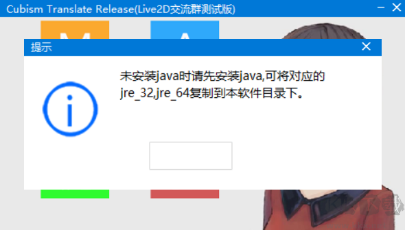 2、仍舊用WinRAR解壓【jre_64】,【jre_32】和【Cubium_Editor_2.1.14_簡體中文新.zip】三個壓縮包,打開【Cubium_Editor_2.1.14_cn.exe】。如果你電腦中裝有Java,可以直接使用。否則會出現(xiàn)下圖情況,需要把解壓的【jre_64】,【jre_32】文件夾放到【Cubium_Editor_2.1.14_簡體中文新】文件夾中。