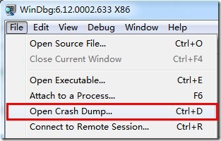1、運行WinDbg工具,這里可以點擊WinDbg界面上的最上方的【File文件】=>Open Crash Dump…】按鈕,來打開一個dmp文件。(打開在彈框中打開我們的dump文件即可。)