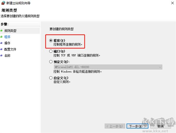 4、之后在窗口中點(diǎn)擊“新建規(guī)則”,在創(chuàng)建中選程序的創(chuàng)建,然后點(diǎn)擊下一步;