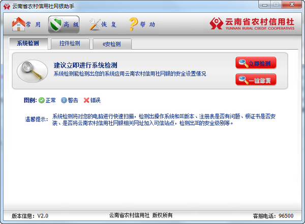 系統(tǒng)檢測(cè)將對(duì)您的電腦進(jìn)行快速掃描,檢測(cè)出操作系統(tǒng)和正版本、注冊(cè)表是否有問(wèn)題、根證書(shū)是否安裝、是否將云南農(nóng)村信用社網(wǎng)銀相關(guān)網(wǎng)址加入可信站點(diǎn),檢測(cè)出IE的安全級(jí)別等。