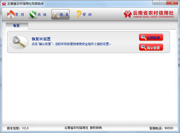 云南農(nóng)信網(wǎng)銀助手可以會(huì)修改你的ie設(shè)置,點(diǎn)擊立即檢測(cè)可以查詢(xún)您的ie設(shè)置是否被安全組件修改。