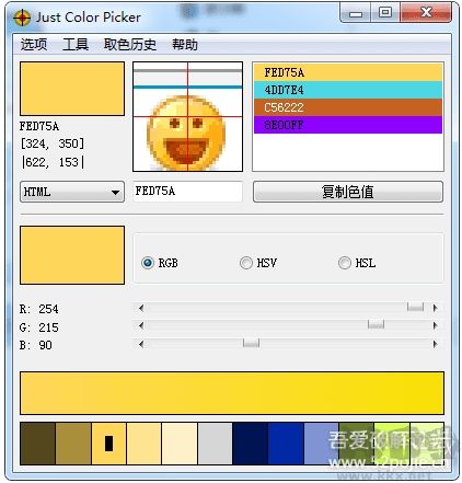 Just Color Picker中文版是一款非常小巧的屏幕取色軟件,在我們平時設(shè)計(jì)、作圖時非常有用,只要把鼠標(biāo)放在屏幕的任何一處,就可以獲取顏色代碼。同時下方也會給出一些參考顏色方案。