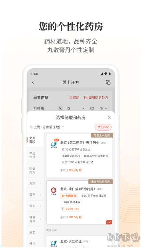 —添加患者、患者線上極速問(wèn)診開(kāi)方、精選道地中藥調(diào)劑后直接閃送送藥到家,線上看病一站式完成。