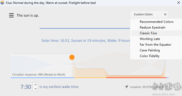 F.lux電腦版是一款能夠根據(jù)用戶(hù)天氣情況而對(duì)桌面亮度進(jìn)行調(diào)節(jié)的軟件,這款軟件能夠自動(dòng)幫助用戶(hù)調(diào)節(jié)屏幕亮度HE 色彩,可以有效的讓用戶(hù)的眼睛進(jìn)入到舒服的狀態(tài)里,感興趣或者有需要的小伙伴就快來(lái)kk網(wǎng)站下載體驗(yàn)一下吧。