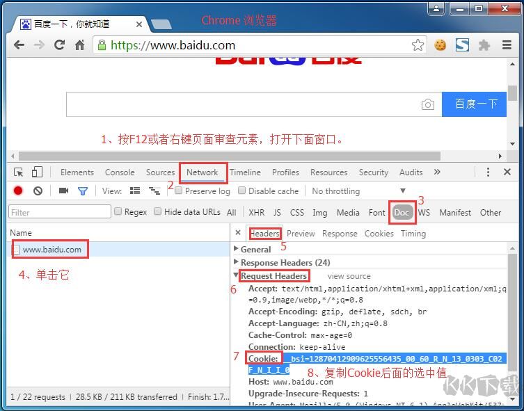 1、打開要下載的頁面,按F12或?qū)彶樵?,打開開發(fā)者工具窗口,如下圖,復(fù)制cookie值。