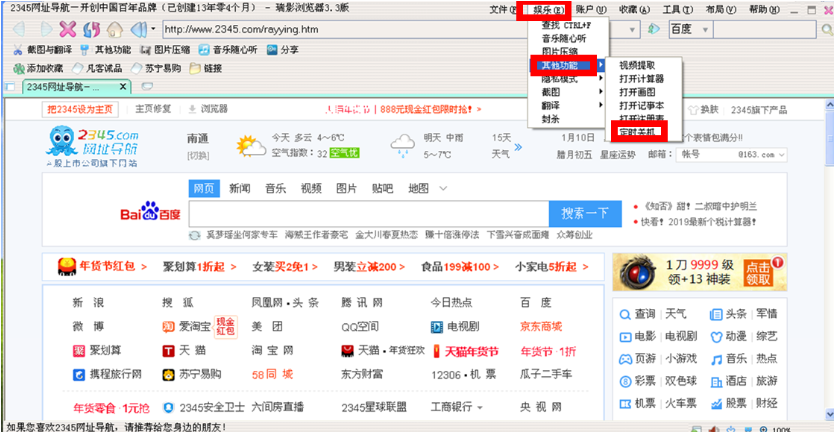 打開瑞影瀏覽器,在頂部菜單欄中點擊【娛樂】——【其他功能】——【定時關(guān)機(jī)】,