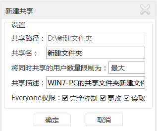 Everyone權(quán)限,用于控制共享目錄的權(quán)限,分別是”完全控制”、“更改”、“讀取”點擊確定按鈕即可完成簡單的文件共享