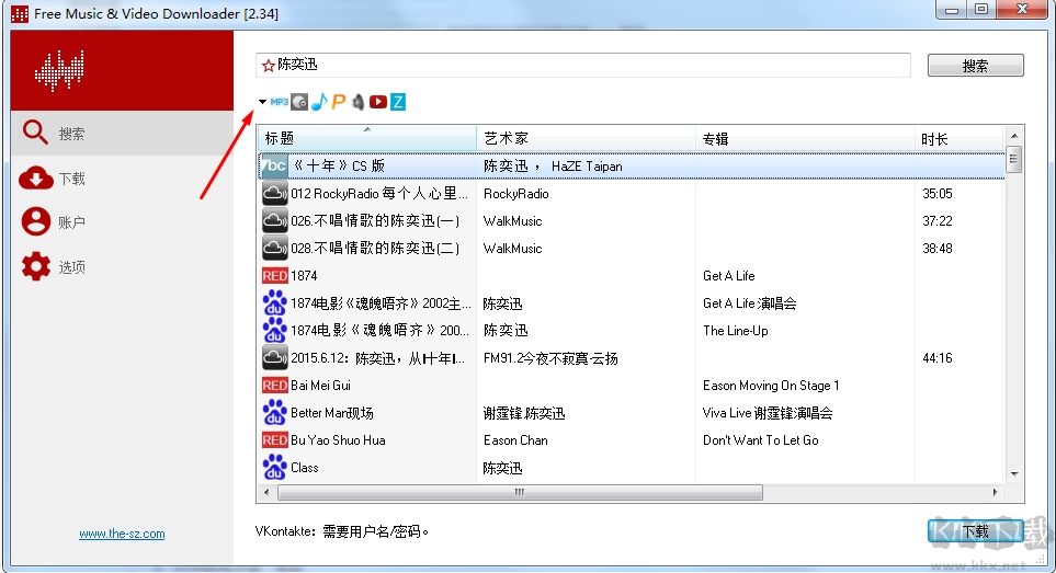 1、打開軟件之后,先點(diǎn)擊如下圖,箭頭選擇要下載的網(wǎng)站。(不然你可能會搜索不到中文歌)