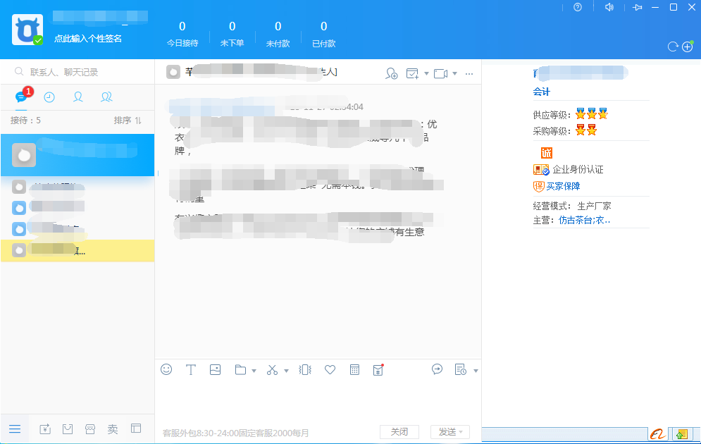 1. 使用最頻繁的就是聊天功能了,使用很簡單,界面上方有今日接待、未下單、未付款、已付款,每天的工作一目了然。