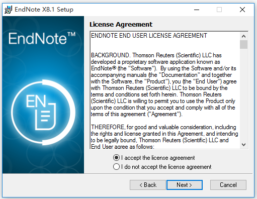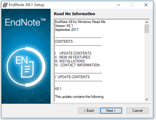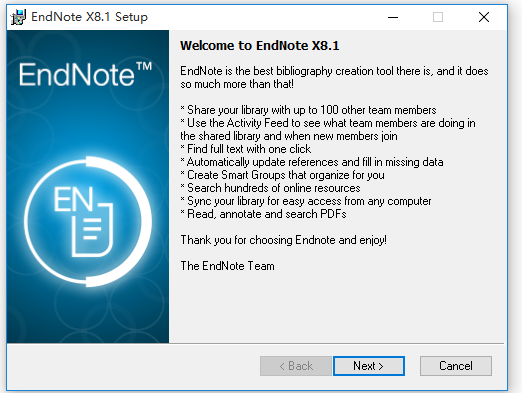 下載EndNote X8,解壓壓縮包,雙擊ENX8Inst X8.1 Build 11010.exe文件,彈出界面,根據(jù)向?qū)崾静僮鳎?/p>