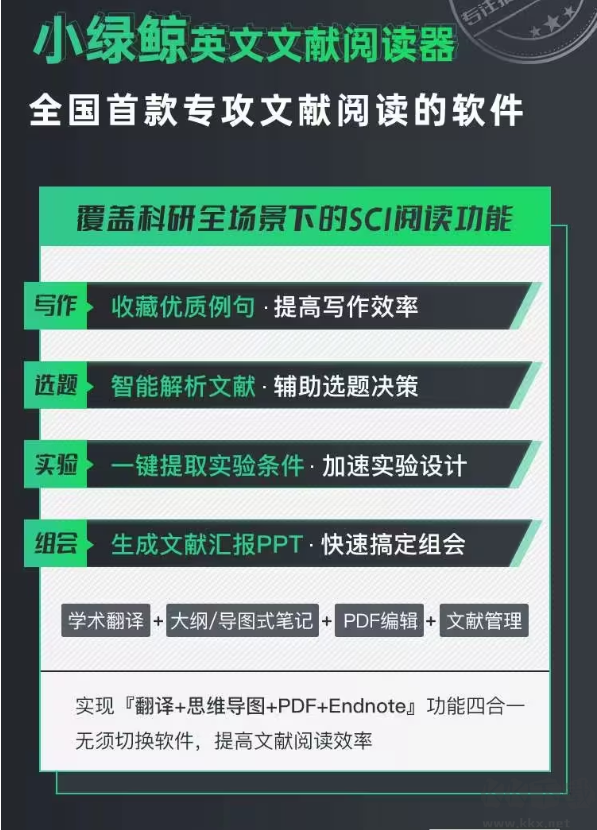 小綠鯨是一款專注提高英文文獻(xiàn)閱讀效率的軟件,集翻譯、文獻(xiàn)管理、筆記、速讀、解析、寫(xiě)作、云端閱讀功能于一體,針對(duì)【選題、做實(shí)驗(yàn)、寫(xiě)論文、組會(huì)匯報(bào)】四大文獻(xiàn)閱讀場(chǎng)景設(shè)計(jì)了專業(yè)的解決方案,從各個(gè)環(huán)節(jié)提高科研工作效率。