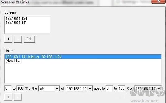 3、Screens 為要所有參與電腦的IP地址,包括服務器端。點擊 + 后僅需填寫第一行的 Name 即可。需逐條添加。Links 可以不做設置。點擊 OK 完成?;氐匠跏冀缑?,進入 Hot Keys…