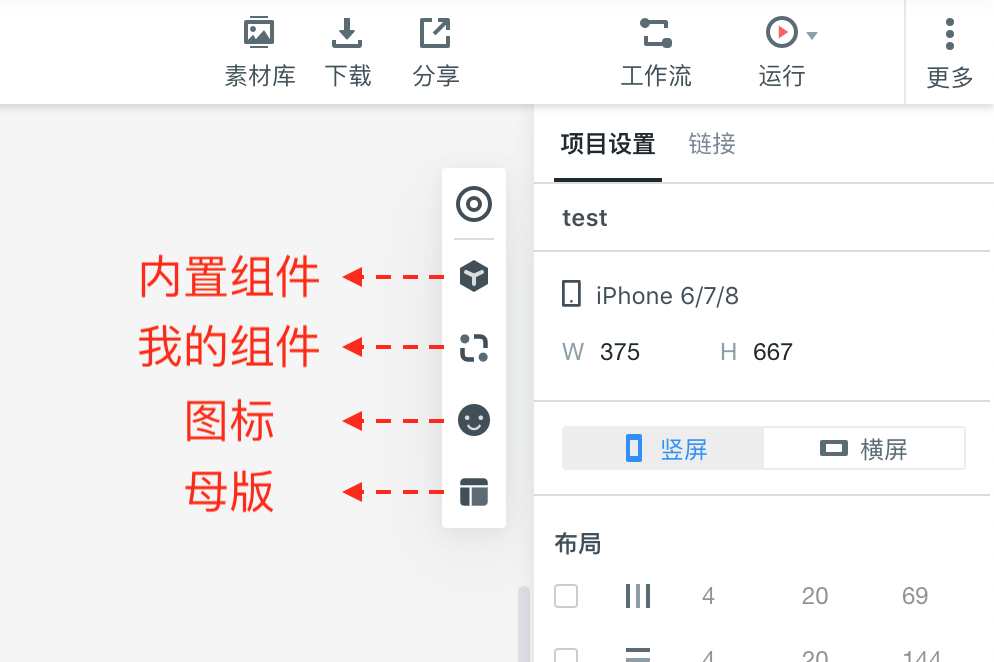 在編輯區(qū)右側(cè)的組件區(qū)域,有「內(nèi)置組件」、「我的組件」、「圖標(biāo)」及「母版」素材,您可以點(diǎn)擊打開(kāi)對(duì)應(yīng)的素材面板,添加您需要的組件。