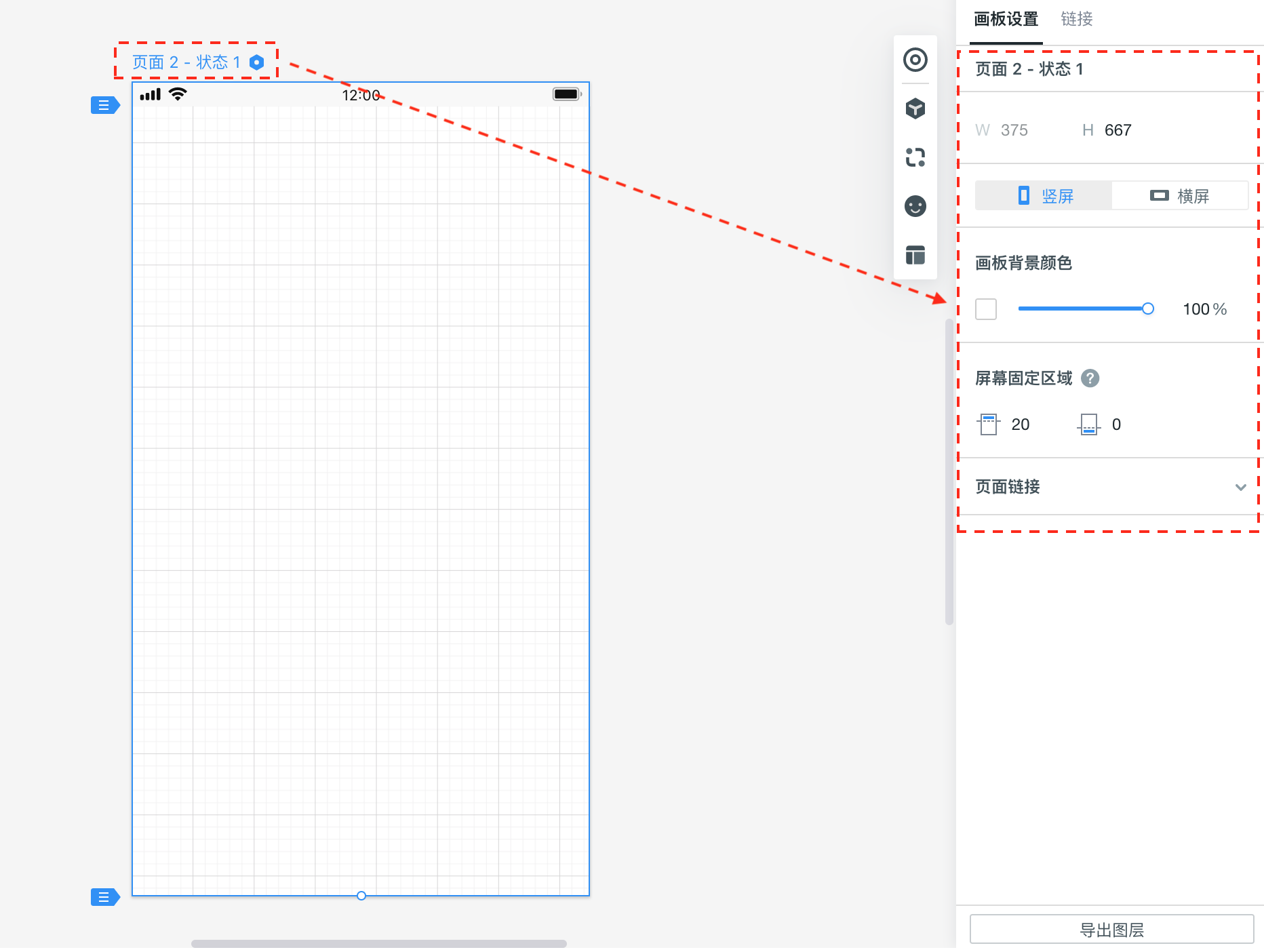 選中整個(gè)頁(yè)面畫(huà)板時(shí),您可以在右側(cè)的外觀設(shè)置面板中設(shè)置頁(yè)面畫(huà)板的外觀(尺寸、背景色)。