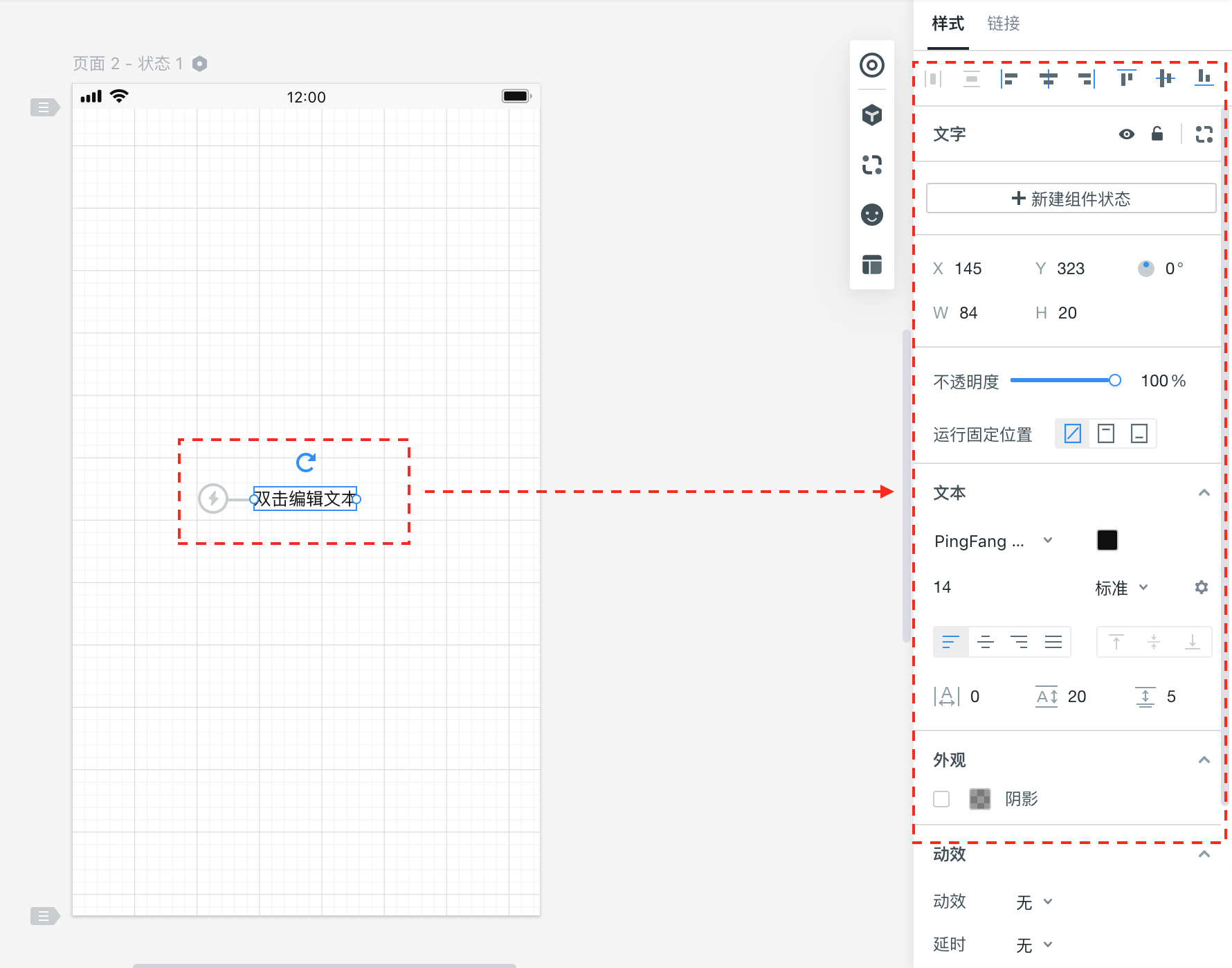選中某個(gè)組件時(shí),您可以在右側(cè)的外觀設(shè)置面板中設(shè)置組件的外觀(如位置、大小、顏色、透明度、陰影、動(dòng)效等)。