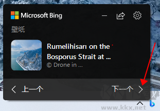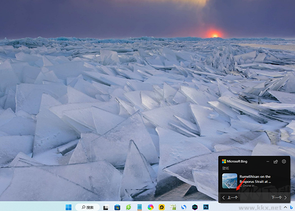 1、在桌面下面的小圖標(biāo)里點(diǎn)擊必應(yīng)壁紙,出現(xiàn)彈窗后通過(guò)上一個(gè)或者下一個(gè);