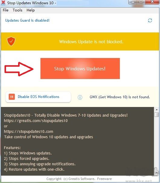 1、通常情況下,下載安裝并運行后,點擊界面上的【stop windows updates!】按鈕即可。