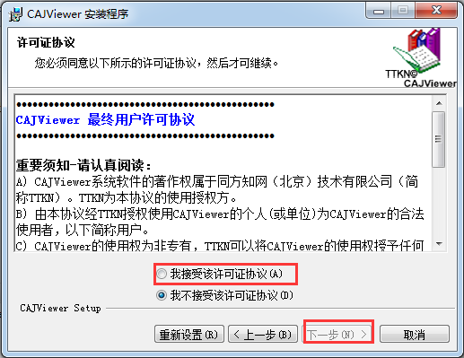1.將KK下載分享的壓縮包解壓到本地,得到的文件夾打開(kāi)后雙擊cajviewer,打開(kāi)安裝程序,可以看到下圖所示的提示: