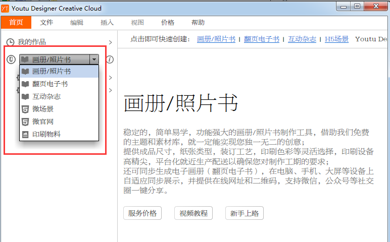 1、打開軟件,選擇要制作的類型,打開下拉菜單,其提供了畫冊、電子書、互動雜志、H5場景等多種類型。