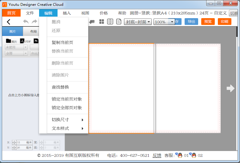 4、在編輯一欄中提供了撤消、還原、復(fù)制當(dāng)前頁、替換當(dāng)前頁、刪除當(dāng)前頁、清除圖片、查找替換、鎖定當(dāng)前頁對象、鎖定全部頁對象、切換尺寸、文本樣式等編輯操作。