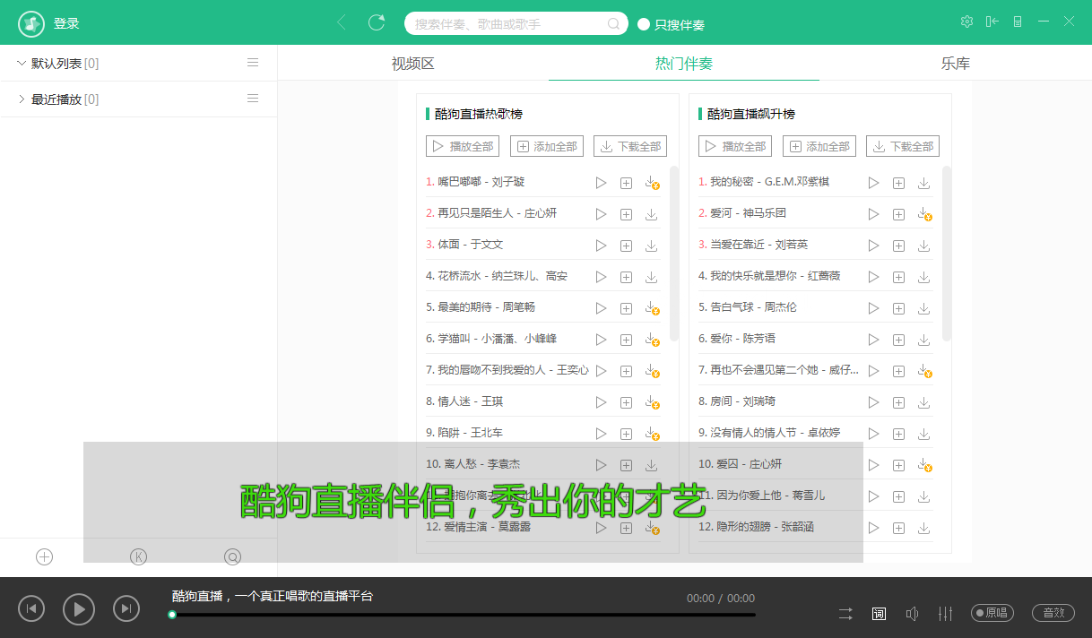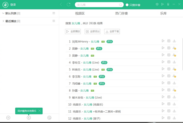 1、打開軟件后,在左側(cè)可以建立列表,右側(cè)音頻區(qū)或者頂部搜索自己喜歡的歌曲,如:女兒情,添加到列表,即可開始播放伴奏,這時候?qū)χ溈孙L(fēng)演唱即可。