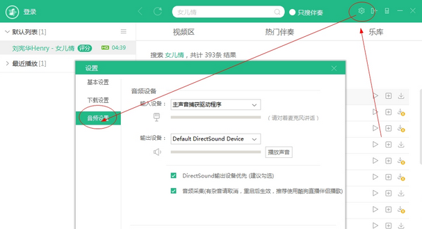 4、最后,有的用戶反映酷狗直播伴侶沒有聲音或麥克風(fēng)不管用,請點(diǎn)擊設(shè)置,看看是否檢測到音頻設(shè)備,如下圖。