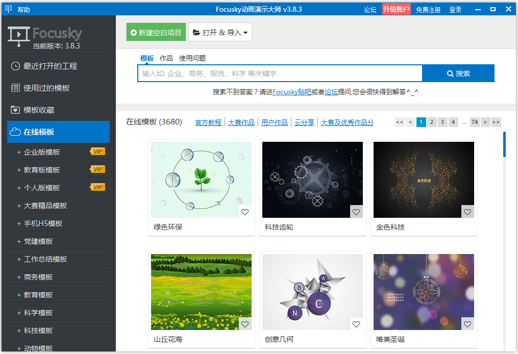 Focusky給予很多精致的模板,換成自身的內(nèi)容就可以用了,能夠迅速的制做出漂亮的多媒體系統(tǒng)ppt。